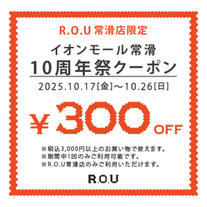 R.O.U 常滑店限定でイオンのトータルアプリ【iAEON】アプリでクーポン配信をいたします!