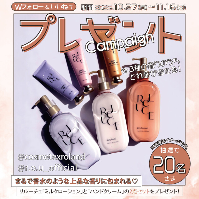 ※コスメテックスローランド 公式アカウントとR.O.U 公式アカウントをフォローいただき、対象の投稿に「いいね」をしていただくことで応募の意思確認とさせていただきます。