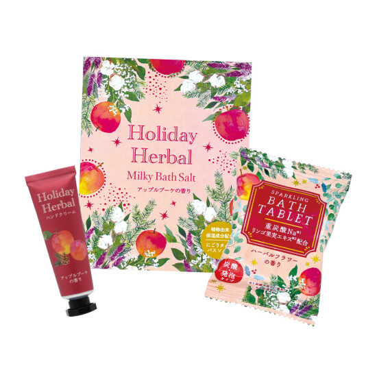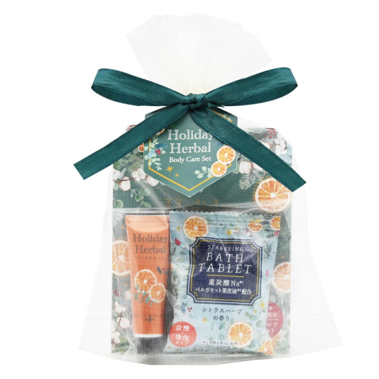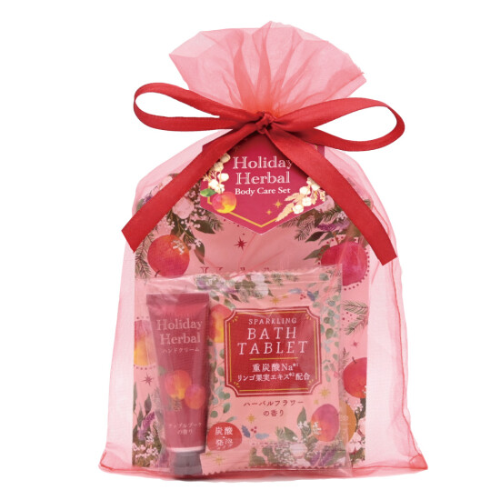 贈り物にぴったりなオーガンジセット。重炭酸バスタブレット、バスソルト、ミニハンドクリーム入り。