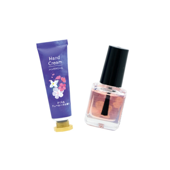 ミニハンドクリームと香り付きネイルオイルのセット。「Thank you」のタグ付き。さくら&チュベローズの香り。