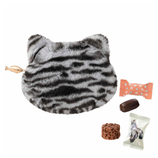 サバトラ猫をイメージしたポーチに2種類のチョコレート菓子を詰め合わせたにゃ。